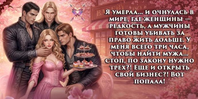 Я умерла… и очнулась в мире, где женщины — редкость, а мужчины готовы убивать за право жить дольше. У меня всего три часа, чтобы найти мужа… стоп, по закону нужно трех?! Еще и открыть свой бизнес?! Вот попала!